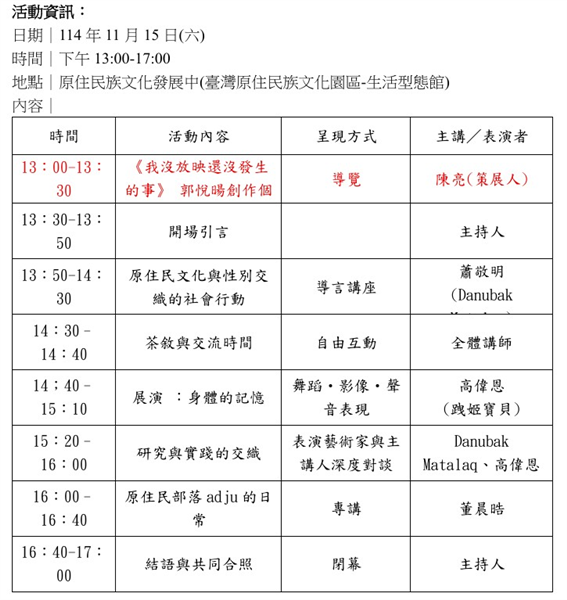 活動內容涵蓋原住民文化與性別交織講座、身體的記憶 舞蹈・影像・聲音表現展演、深度對談,以及部落啊都的日常分享,邀請學者、藝術家與部落青年共同參與,從身體、歌舞等文化實踐出發,探討性別如何在不同族群中交織、變化與再現。同時也會特別邀請策展人陳亮,導覽介紹藝術家郭悅陽的影像作品。