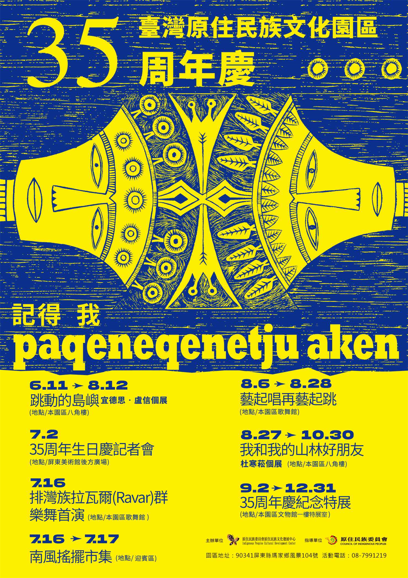 臺灣原住民族文化園區35歲囉!本園區自民國76年開園以來,致力於原住民族文化之典藏、保存、展示(演)及推廣,不僅見證大時代的變革,開創多元文化發展的曼妙,更參與了許多朋友們生命中寶貴的時刻與記憶。